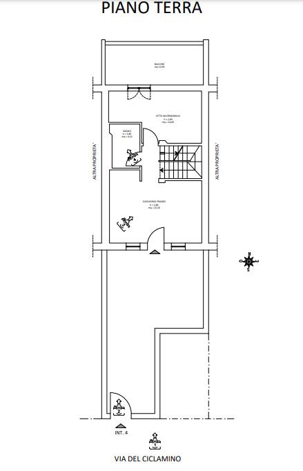 L'immobile si compone al piano seminterrato di un locale magazzino avente consistenza di 18,98 mq, di un disimpegno di 1,20 mq che serve tre ambienti differenti ovvero un bagno cieco di 4,18 mq, un ripostiglio di 2,21 mq posto al di sotto della rampa di scale, e un locale cantina di 17,36 mq. L'intero piano seminterrato è collegato al piano terra da una scala interna. Il piano terra è costituito da un soggiorno con angolo cottura di totali 20,38 mq al quale si accede tramite l'ingresso pedonale di Via del Ciclamino e risulta ben illuminato da due finestre delle medesime dimensioni il cui piano d'imposta è a 0,90 m dal pavimento. Dal soggiorno si accede al disimpegno di 2,24 mq che serve un bagno cieco di 4,13 mq, una camera da letto di 13,70 mq