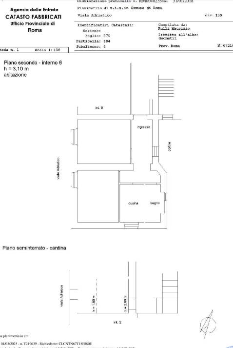 Appartamento di mq 67 a Roma, quartiere Monte Sacro, In Viale Adriatico n. 159 posto al Piano Secondo con annessa cantina di mq 11 al Piano Seminterrato. L'immobile è composto da ingresso, soggiorno, cucina, una camera da letto ed un bagno. Internamente infissi in PVC con doppio vetro e pavimenti in grès porcellanato. Il tutto in normale stato di conservazione come riportato sulla CTU visionabile presso lo Studio.