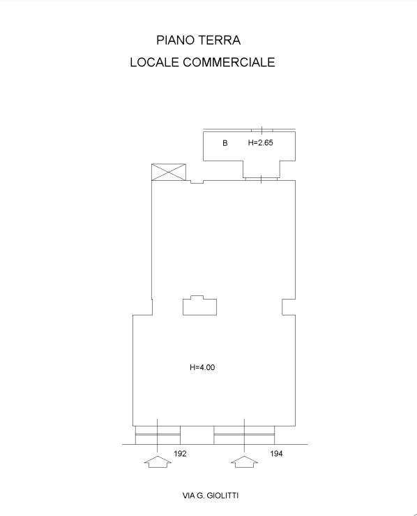 Locale Commerciale di mq 59 a Roma, zona Esquilino, in Via Giovanni Giolitti n. 192 posto al Piano Terra. Dai civici 192 e 194 si accede al negozio, rappresentato in pianta da una figura assimilabile ad un rettangolo irregolare con annesso servizio igienico. Il tutto in discreto stato conservativo come riportato sulla CTU visionabile presso lo Studio.